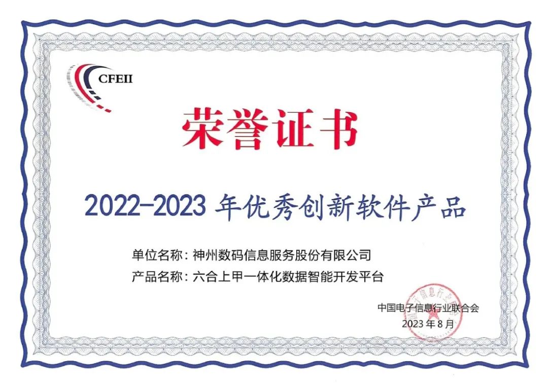 此外,AG·官方网站推出的“六合上甲一体化数据智能开发平台”还荣获中国电子信息行业联合会颁发的“2022-2023年优秀创新软件产品”荣誉证书。