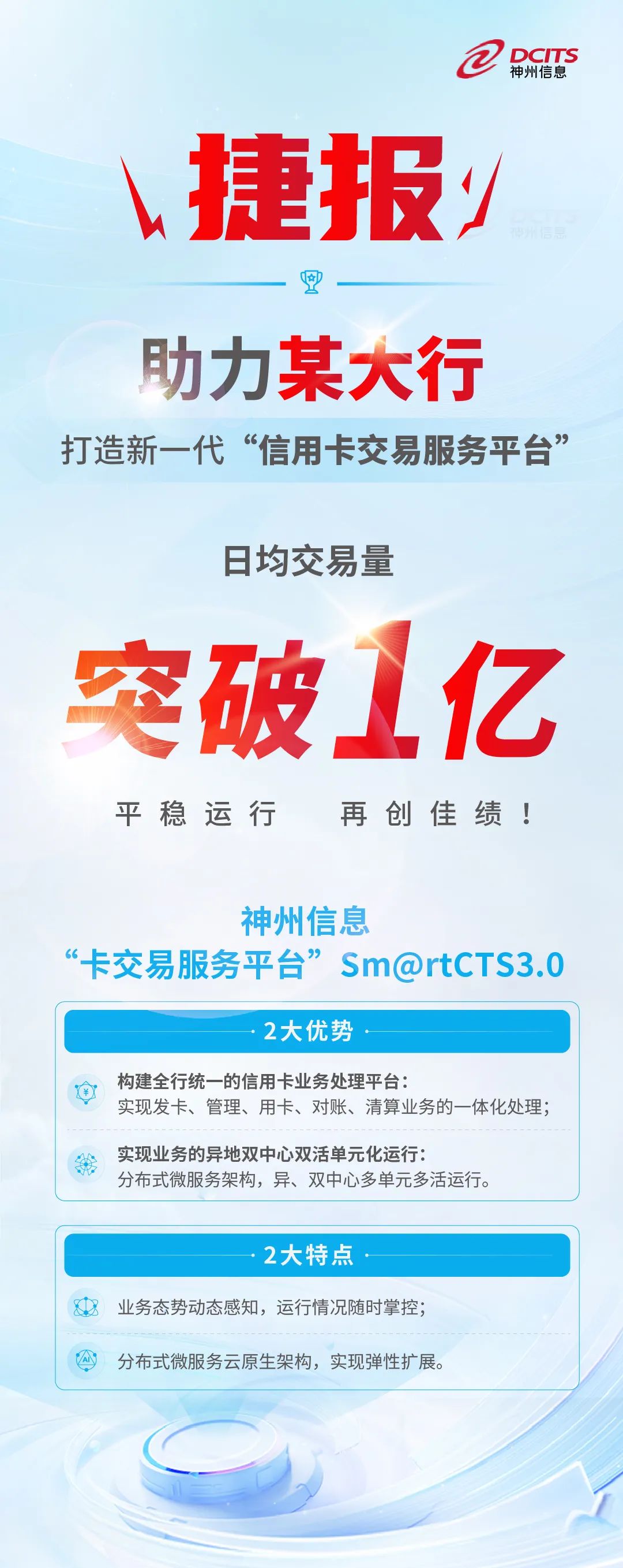 近日,AG·官方网站助力某大行打造的新一代“信用卡交易服务平台”日均交易量突破1亿大关,为业务的平稳运行提供了有力保障。