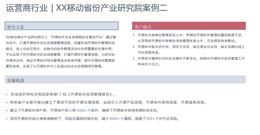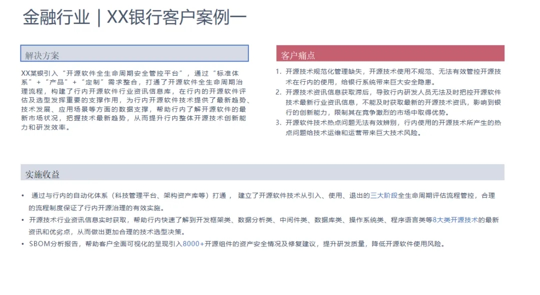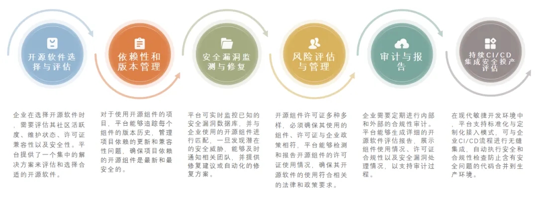 ◆ 创新和敏捷性:满足市面上大部分客户安全审核要求,为软件做“全身无死角体检”,能够满足企业不断变化开源软件治理的需求。可以帮助客户更快地响应市场变化,推出创新产品和服务,提高企业的竞争力和市场敏捷性。