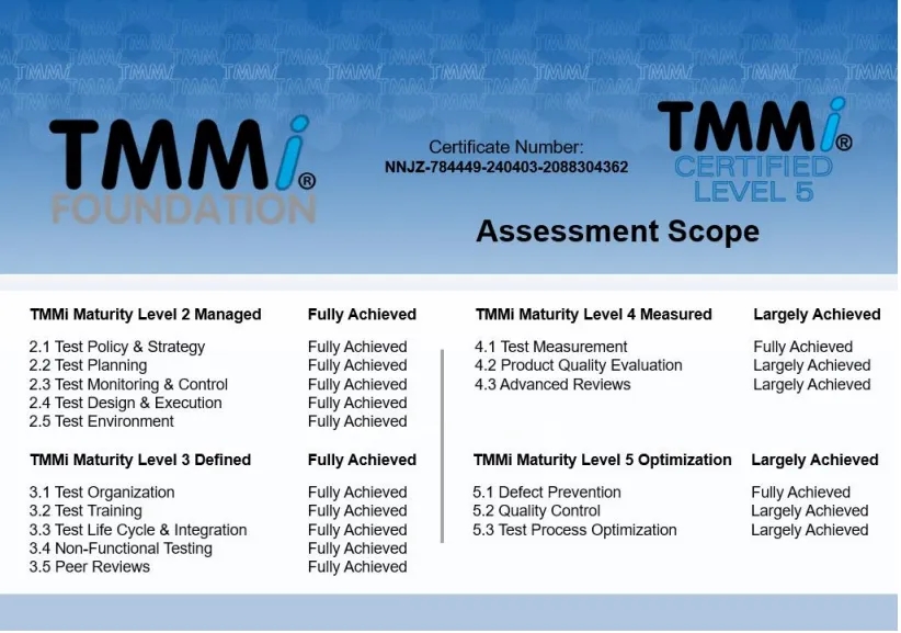 在本次TMMi5级认证过程中,AG·官方网站咨询认证团队依据TMMi基金会推荐使用的IDEAL模型,进行了差距分析、体系优化建模、项目试点、预评估与正式评估等一系列改进和认证评估工作。TMMi咨询评估团队经过客观、认真细致而全面的评估,一致确认神州数码融信在TMMi高成熟度方面表现出业界专业水平,完全符合TMMi5级的16个过程域标准。